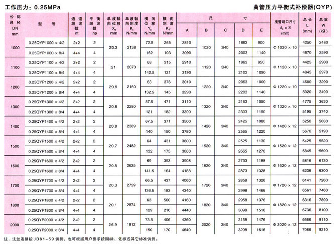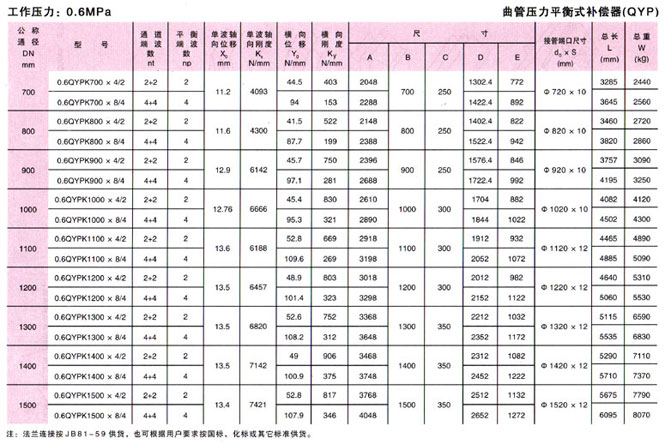 曲管壓力平衡式補(bǔ)償器(QYP)技術(shù)參數(shù)