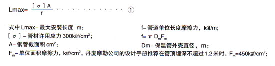 管道_安裝長度計算有補償直埋的管道應在二處高固定點,一是在直管段的端部,二是在管道的分支處。 長的無分支的直線管道兩補償器之間可以不設固定點,靠管道自然形成的“駐點”即可發(fā)揮固定點的作用。 駐點是兩補償器之間管道的那個不動點,在管徑相同,埋深一致時,駐點與兩補償器間的距離相等。 補償器(包括轉角處自然補償器)至固定點之間的距離不得_管道的_安裝長度Lmax,管道_安裝長度的定義是固定點至自由端(補償器)的長度,在此長度下產生的摩擦力不得_管道許用應力下相應的彈性力。Lmax按下式計算: